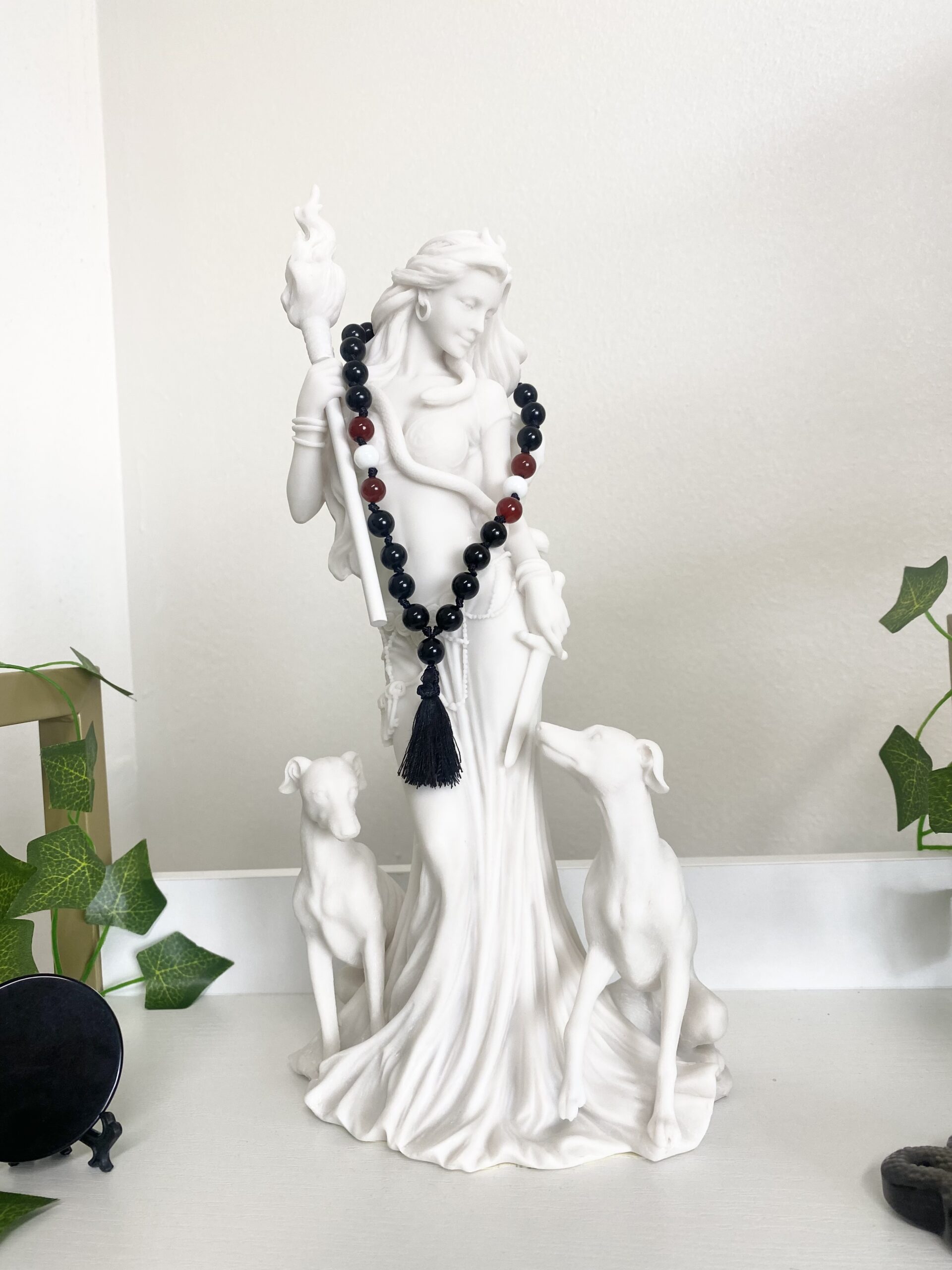 This Mini Mala is handmade with 27 Beads of Black Agate, Carnelian, White Onyx Beads & represents the Trilogy of her legacy. Hecate’s energy is channeled while knotting the beads to this Mala. It is 7 inches long. This Mala is perfect for your Altar, to wear with you for protection or as an offering for your Hecate Statue.